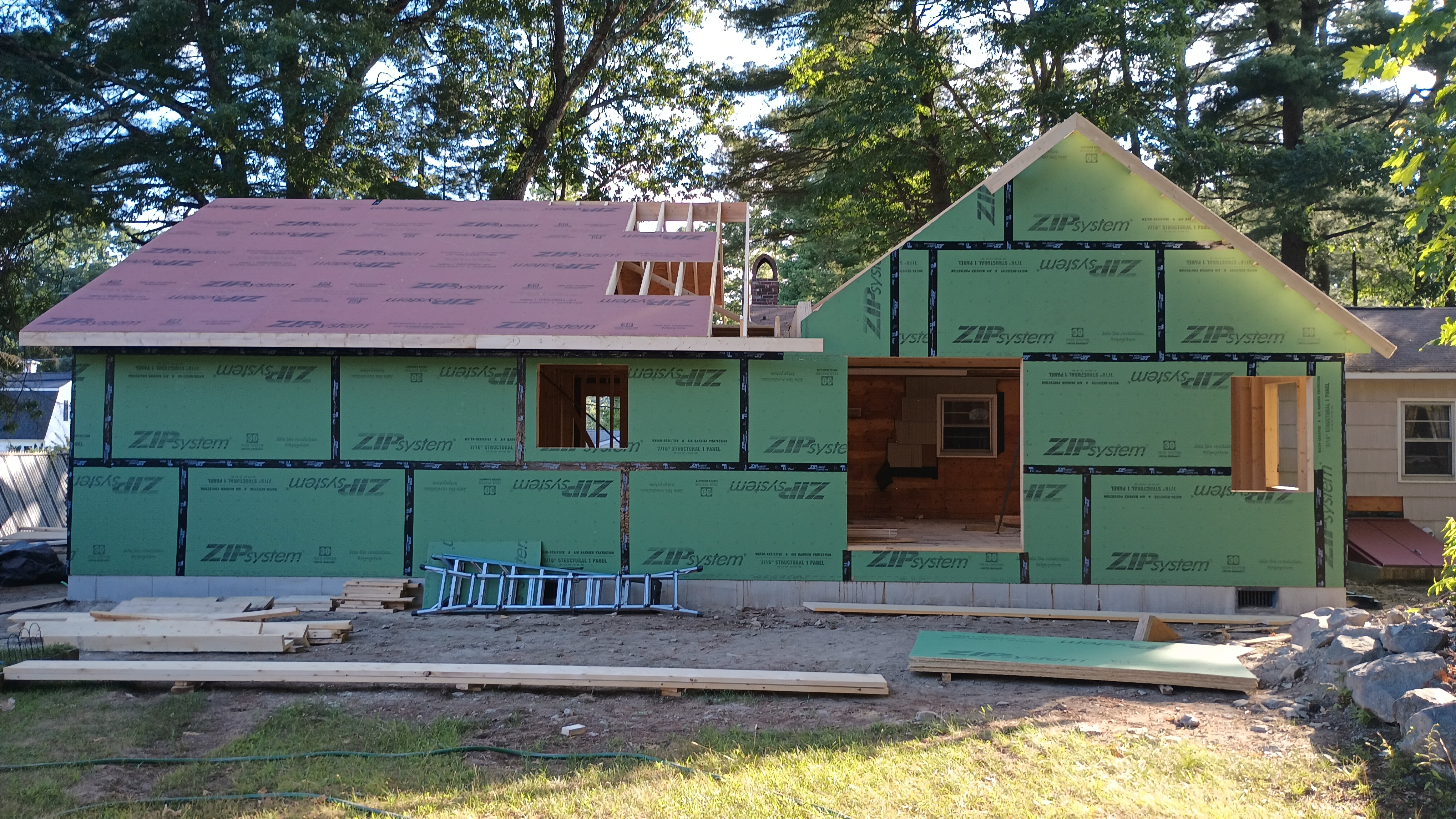 They got rafters in place over the addition, but they haven't removed the old roof yet. Due to